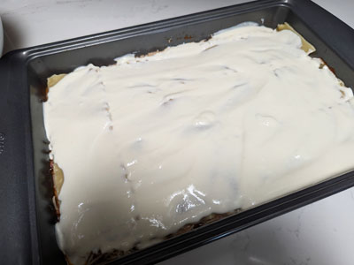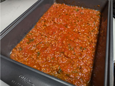 Ladle some of the meat sauce on the bottom of your baking dish; just enough so that the noodles do not stick.