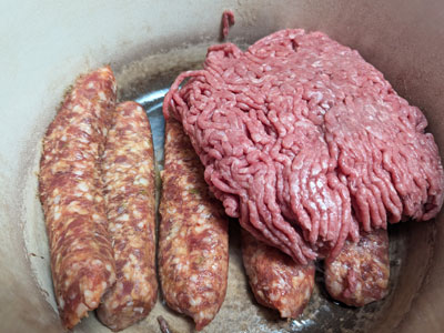 In a 5 quart dutch oven or larger, brown the ground beef and Italian sausage over medium high heat. Use a wooden spatula to chop the meat as it browns.