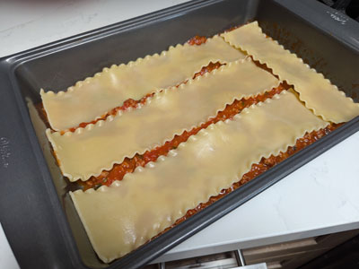 Lay the lasagna noodles over the sauce, side by side so that all of the sauce is covered within the pan. Depending on the size of your pan you may need to cut some of the noodles to fit.