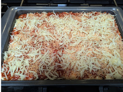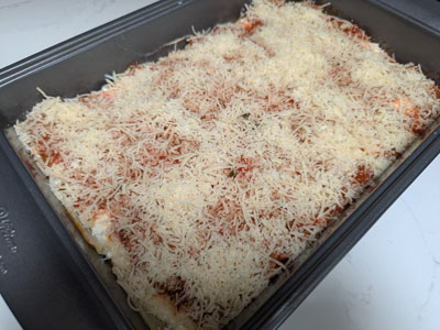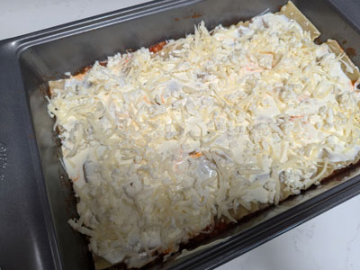 I hand grated a block of mozzarella cheese together with a fresh mozzarella ball to make a blend. The blend was 4 ounces of grated block mozzarella with 8 ounces of soft fresh mozzarella. Another 4 ounces of the block mozzarella was set aside for melting over the top of the lasagna. I also picked up a 10 ounce carton of grated Parmigiana Reggiano that will be included in some layers as well.