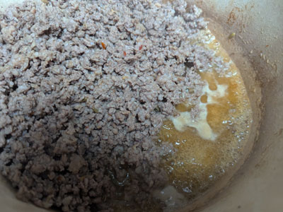 When all the meat has browned, scoop the meat over to one side so you can see any excess grease. You’ll want to drain this excess grease.