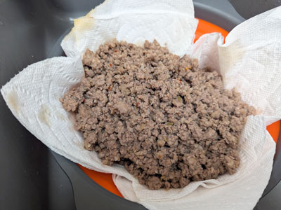 Line a colander with paper towels and spoon the meat into the bowl. The paper towels will absorb any excess grease. Set aside.