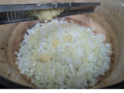 Use a microplane grater to grate the garlic cloves and add to the onions.
