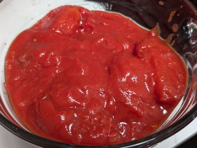 Pour the cans of whole Italian tomatoes with sauce into a large bowl. It will be approximately 7 – 8 cups.