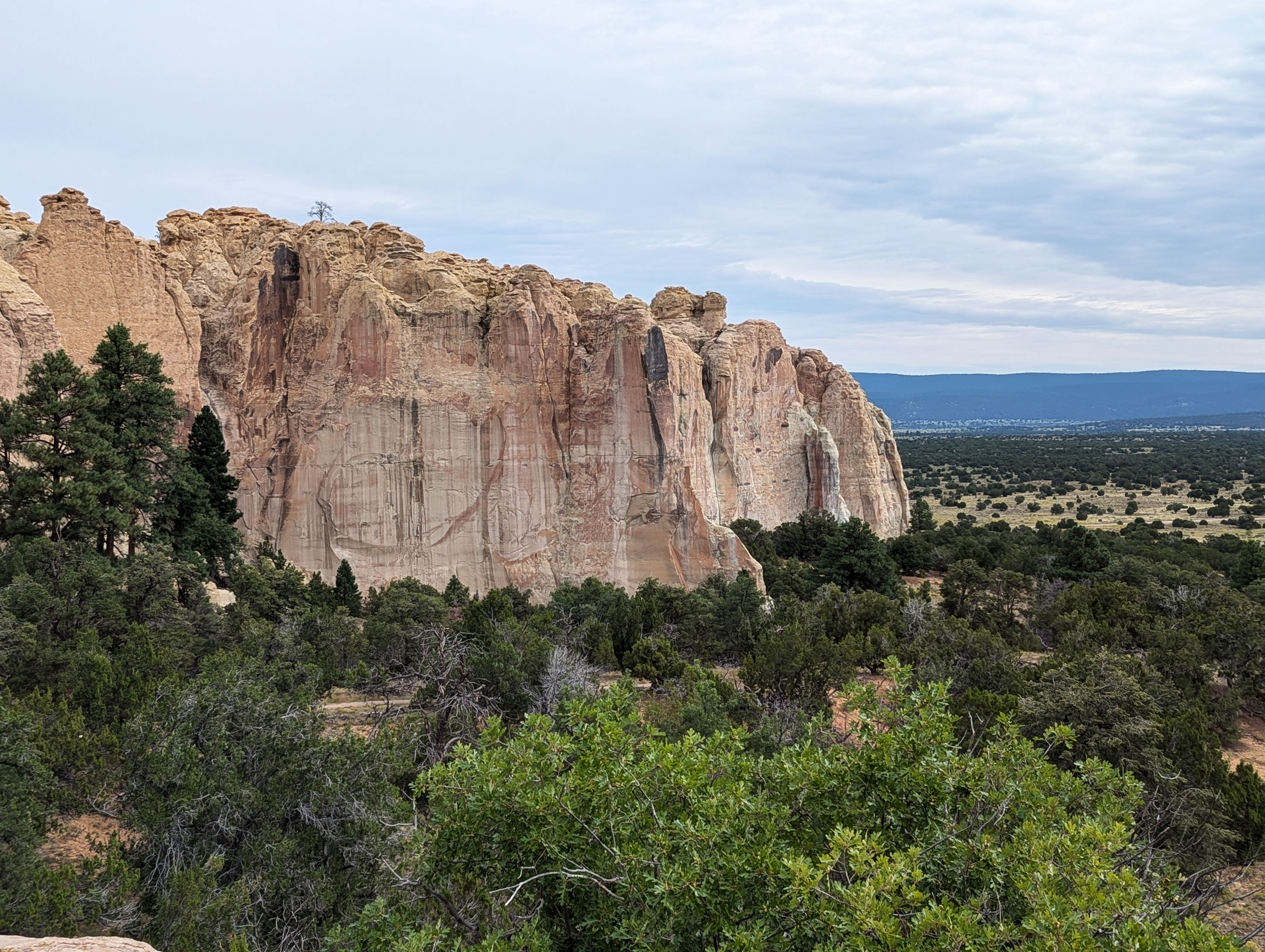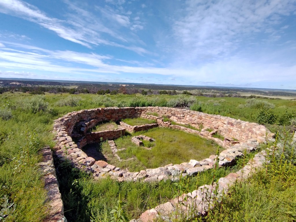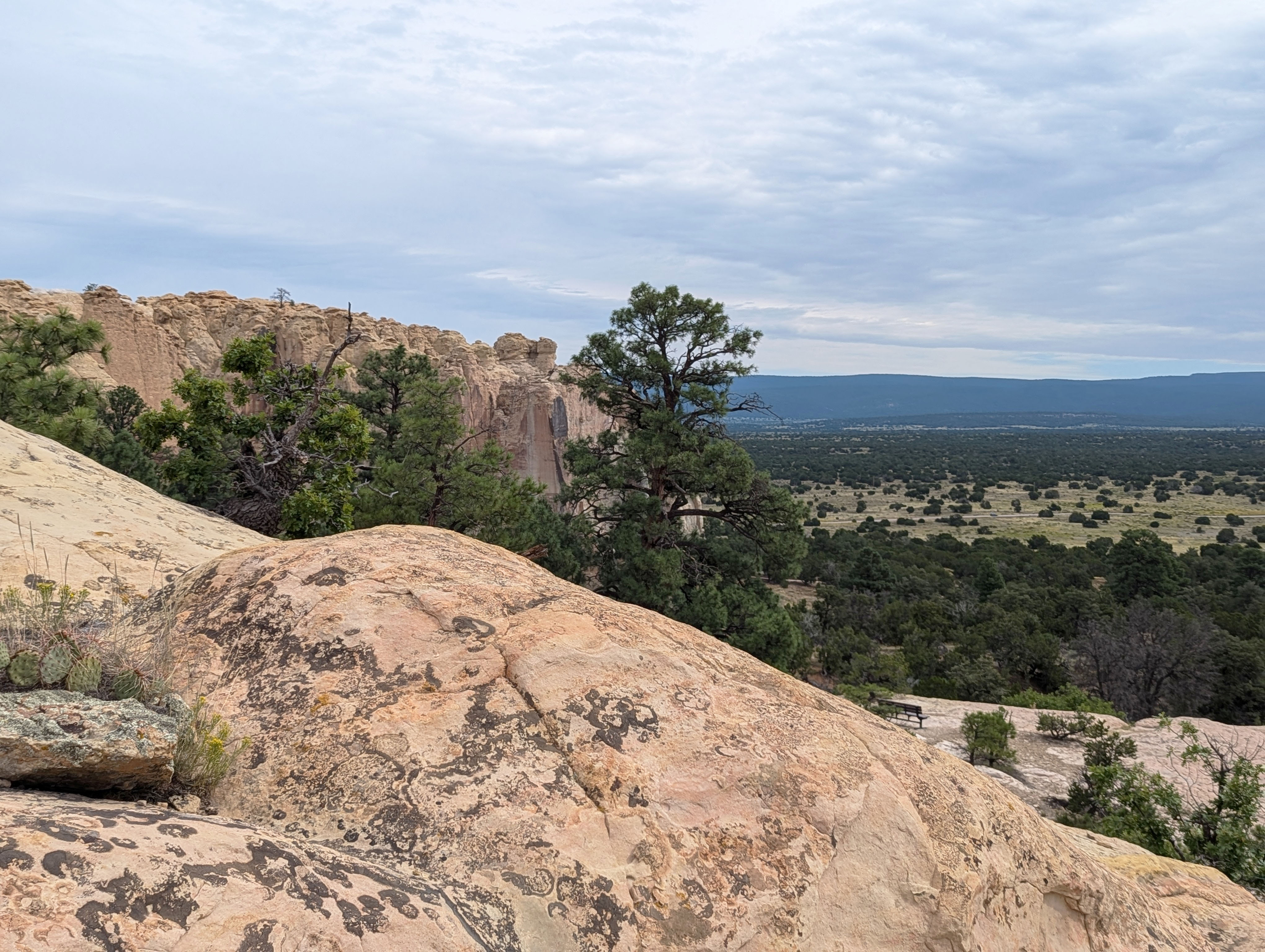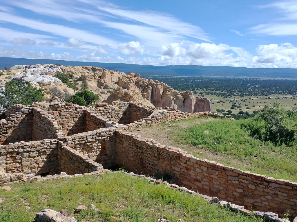 Check in at the visitor center for information on trails. There are no entrance fees to visit the park, however their website indicates that the park is closed Tuesdays and Wednesdays. The 2 mile Headland Trail starts at the back of the visitor center and will take you to the top of the mesa where you can look out over the landscape for miles in any direction. As the trail winds down you will be able to see Inscription Rock with all the history of those who carved their names and messages into the rock. **Pictures with bright blue skies and fluffy white clouds were from August 2022 while those with a moody cloud covered day were from August 2024. Both days were beautiful in their own perspectives.