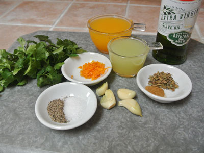 This is my go to Mojo Pork marinade. You’ll need orange juice, lime juice, orange zest, cilantro, garlic, Mexican oregano, cumin, salt, pepper and olive oil.