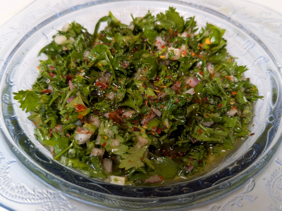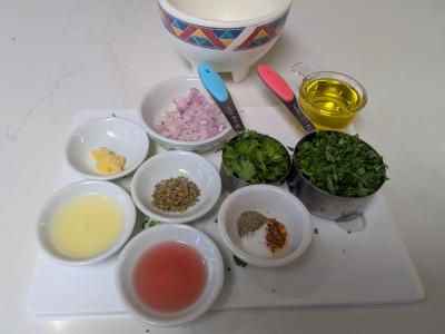 Make the chimichurri just before you are ready to grill the tenderloin. You’ll need some chopped parsley, chopped cilantro, dried oregano, minced red onion, grated garlic, lemon juice, red wine vinegar, olive oil, salt, black pepper and red pepper flakes. I ground some guajillo chiles that I used in place of pepper flakes.