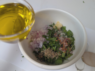 Let it sit for a few minutes, the herbs, red onion and garlic will begin to wilt into the oil and it will become more flavorful. Cover with plastic wrap and refrigerate if not using within 30 minutes.