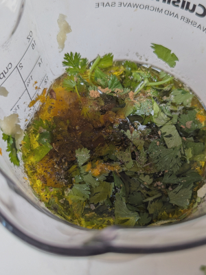 Place all the marinade ingredients into a small food processor or immersion blender and process until it’s completely blended.
