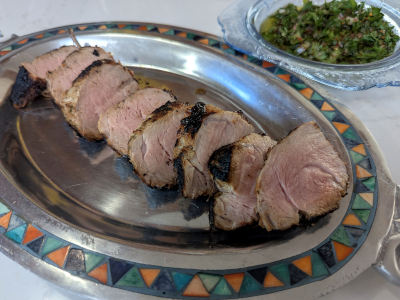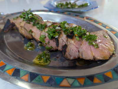 Pork tenderloin on the black top with chimchurri sauce. DELICIOUS! Thanks for the inspiration.