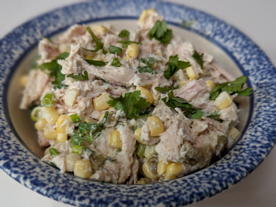 The ingredients I used in this chicken salad is pulled smoked chicken, mayo, sliced green onion, roasted green chile, cilantro, fresh corn cut from the cob, garlic powder and chile lime salt. In place of the chile lime salt you could add a spritz lime juice, along with red chile flakes and sea salt.