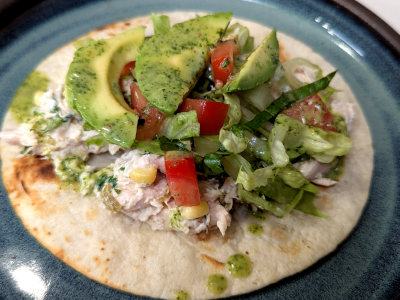 Earlier in the summer I smoked 2 whole chickens, pulled the meat and vacuum sealed it for the freezer. I find many ways to incorporate smoked chicken into soups and salads as well as recipes that need cooked chicken like enchiladas. Smoked chicken tastes a lot like rotisserie chicken in that it is moist, tender and quite flavorful. This chicken salad reflects my NM roots with roasted green chile and fresh corn blended together with a creamy mayo and chile lime salt. There are many flavors throughout but adding a drizzle of cilantro lime vinaigrette took this wrap to another level. The vinaigrette is tangy and robust that adds to the chicken salad topped with lettuce, tomato and sliced avocado. Next time you have some leftover cooked chicken, give this wrap a try.