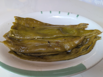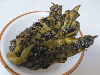 Roast green chiles over an open flame of a gas stove, turning often until they are blistered over all sides. Place in a plastic bag and let them steam for 20 – 30 minutes. Another method is to place chiles on a baking sheet and roast under the broiler of the oven turning them every 5 minutes as they blister over all sides. Place in a plastic bag to steam 20 – 30 minutes for easy peeling.
