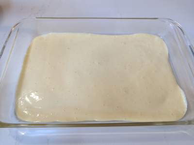 Spray cooking spray into a 9 x 13 baking pan. Pour half of the fluffy egg batter to cover the bottom of the baking pan.