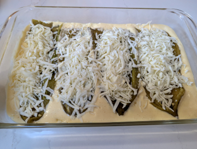 Lay out 4 of the green chiles out across the batter and cover with grated cheese.