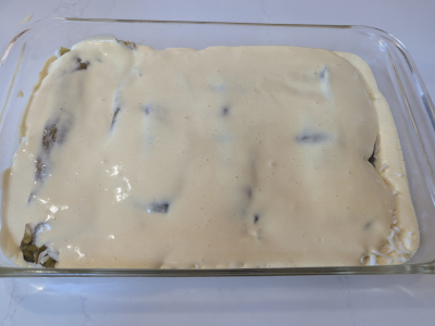 Spread the batter with a spatula to cover the cheese filled green chiles.