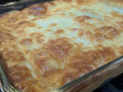 Pour half of the batter into the prepared baking pan. Lay 4 of the green chiles over the batter and generously add grated cheese. Lay the remaining 4 chiles over top of the filled chiles. Spread the remaining batter over top with a spatula. Add grated cheese over top and place in a preheated oven for 40 – 45 minutes. Let cool before serving.