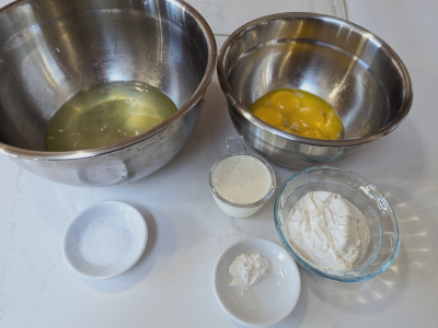 Separate the eggs into two bowls with the egg whites in a larger bowl and the yolks in a smaller bowl. To the egg whites you’ll add salt. The egg yolks will be combined with baking powder, flour and heavy cream.