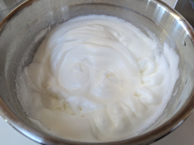 Beat the egg whites and salt with a hand mixer on high speed until it becomes fluffy with stiff peaks. Set aside.