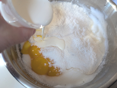Add the baking powder, flour and heavy cream to the bowl with egg yolks. Mix on low speed until well combined. Fold the batter into the egg whites until it resembles a fluffy egg batter.