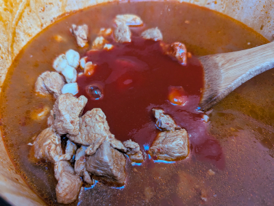 Bring the mixture almost to a boil, then lower the heat, place a lid on top and let simmer for about 4 hours, stirring every 30 minutes to a hour.