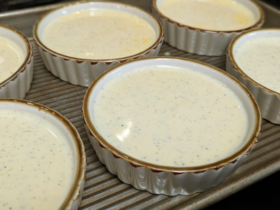 Pour the mixture evenly between 6 crème brûlèe ramekins. Carefully pour hot water into the baking dish until it is halfway up the sides of the ramekins. Bake in a preheated 325 degree oven for 30 – 35 minutes or until the edges are set but slightly jiggle in the center. The center will continue to set after they are removed from the oven.