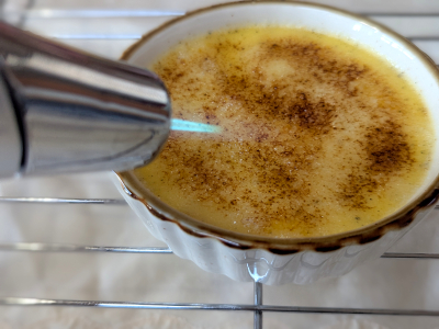 When ready to serve, add a thin layer of caster sugar over the custard and use a mini torch to burn the sugar until it begins to caramelize and become crisp. Let the sugar harden for a minute before serving.