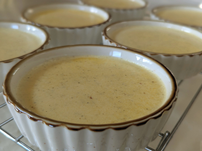Pour the mixture evenly between 6 crème brûlèe ramekins. Carefully pour hot water into the baking dish until it is halfway up the sides of the ramekins. Bake in a preheated 325 degree oven for 30 – 35 minutes or until the edges are set but slightly jiggle in the center. The center will continue to set after they are removed from the oven.