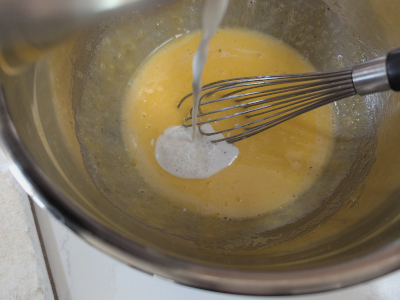 Begin to slowly add the warm cream to the egg yolks, whisking as you pour to temper the eggs.