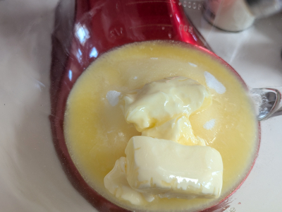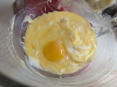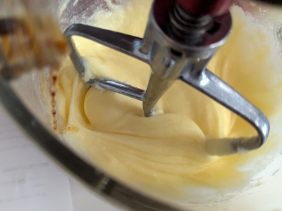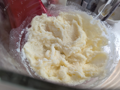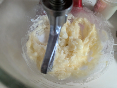 Place your measured sugar and softened butter into the bowl of a stand mixer. Beat the butter and sugar until it appears light and fluffy.
