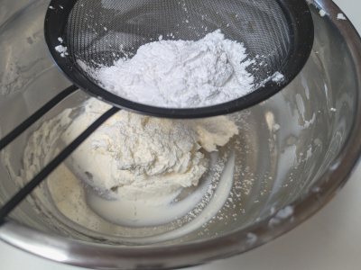 To make the cake: Combine the dry ingredients of flour, baking powder and salt. Stir to combine. Set aside.