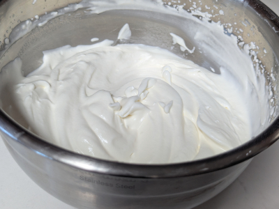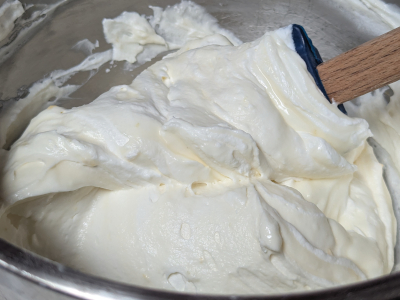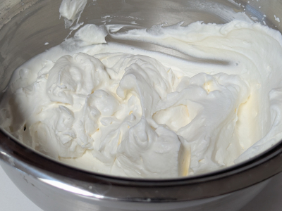In another bowl, add a cup of heavy cream. Use the whisk attachment of a hand mixer to whip into stiff peaks. Fold the whipped cream into the lemon cream cheese mixture until it is smooth and fluffy. Set aside.
