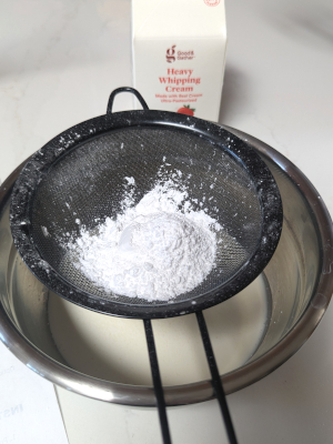 To make whipped cream: Add the heavy cream and sifted powdered sugar together and use the whisk attachment to whip into soft peaks. Set aside.
