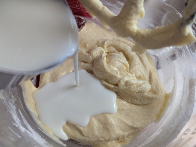 This is the last of the buttermilk addition. Once blended together, add the lemon zest and 1 tablespoon of lemon juice. Beat a few turns on the mixer until the lemon zest and juice has been incorporated.