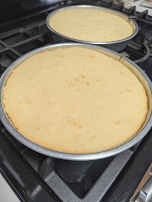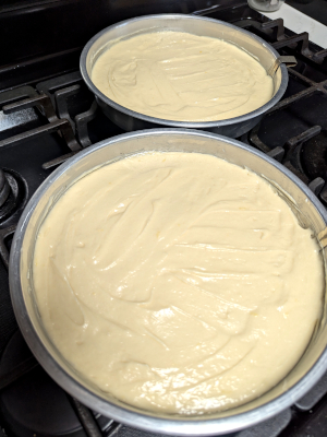 Preheat oven to 350 degrees. Run a pat of butter along the bottom and sides of two 9″ round cake pans. Divide the cake batter between the 2 pans. Bake 30 – 35 minutes or until toothpick tested. Cool completely.