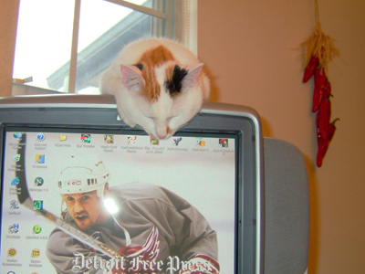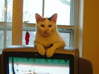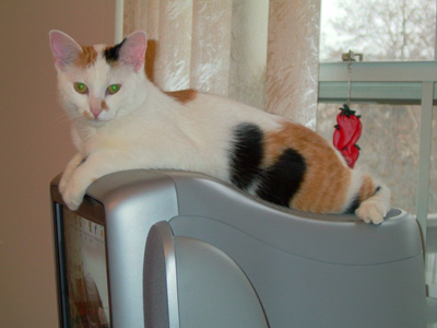 Her favorite spot was the old monitor, probably because it was warm. She got to the point where she was really too big but continued her perch until I got a flatscreen.
