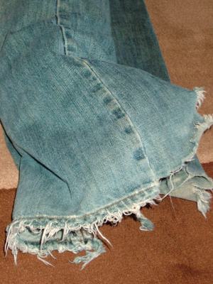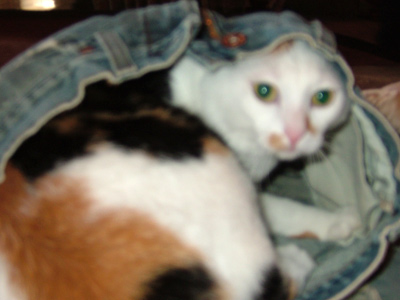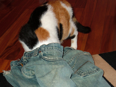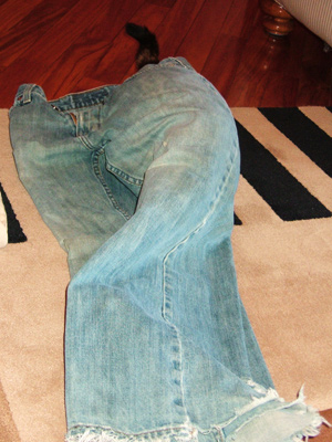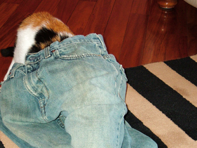 Until she gets to the bottom of the ratty old boy jeans where it’s no longer warm. There are cat whiskers peeking out but instead of coming out she turns around and heads back the other way.