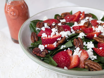 I’ve always loved spinach to make salads or to enhance a pasta or soup dish. Recently I’ve been on a salad kick and this Strawberry Spinach Salad with Candied Pecans was one of the best. The strawberries had the perfect amount of sweetness which balanced the spinach, candied pecans and goat cheese crumbles. I had some strawberries in the freezer and picked out a few to make a strawberry vinaigrette. It goes quite well on this salad but you can also go with a balsamic vinaigrette if you prefer a more savory dressing. The candied pecans give the salad texture and crunch while the goat cheese counters the sweetness with a bit of tangy creaminess. It all comes together to make a flavorful salad to go alongside most any entree.